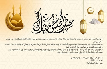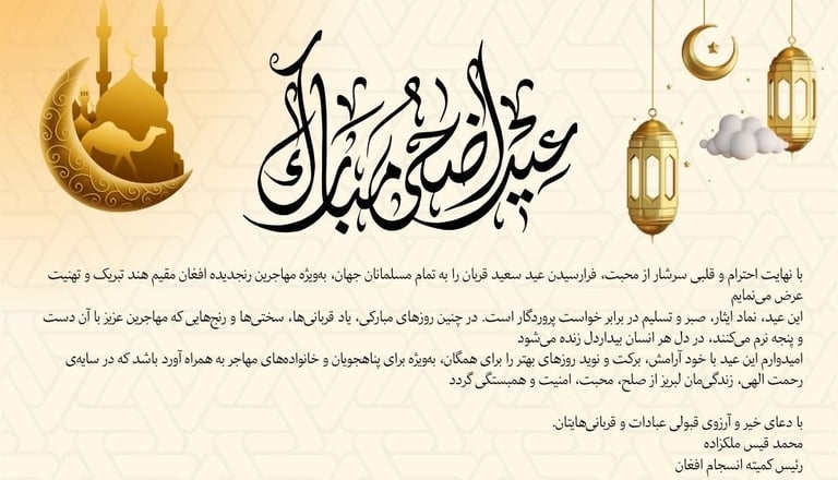 با قلبی سرشار از محبت و همدردی، فرا رسیدن عید سعید قربان را به تمام مسلمانان در سراسر جهان، بهویژه پناهندگان و پناهجویان رنجدیده افغان مقیم در هند تبریک و تهنیت عرض مینماییم.